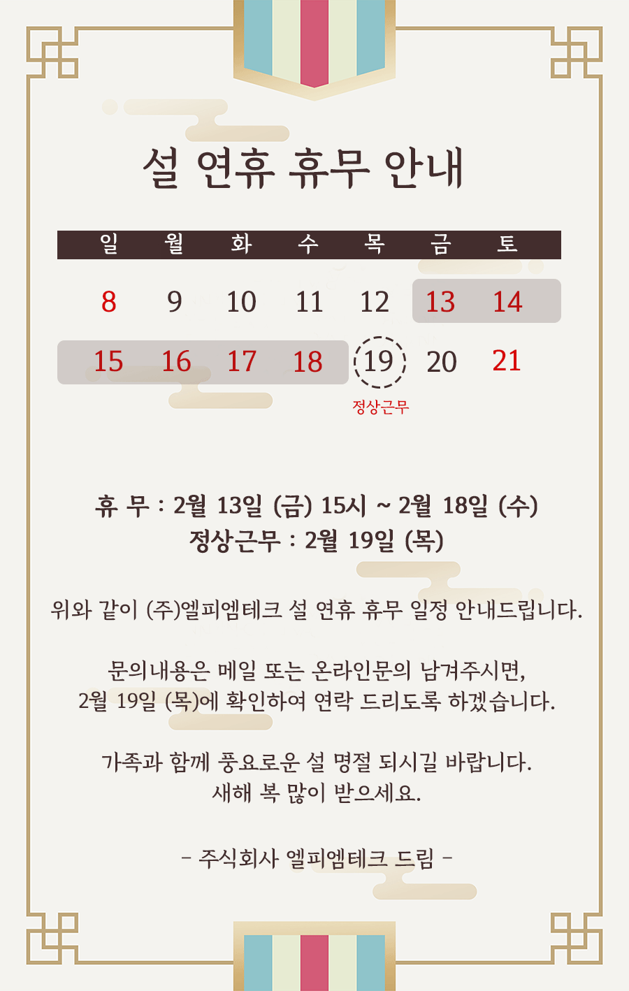 – 개인정보보호담당자 이메일 : lpm@lpmtech.co.kr 전화번호 : 02-866-6211 주소 : 서울특별시 금천구 가산디지털1로 58, 에이스한솔타워 1002호